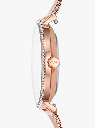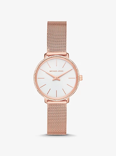 Our Pyper watch is the definition of everyday elegance. Designed with a timeless mesh strap, this rose gold-tone style features pavé accents and an iridescent mother-of-pearl watch face. Wear it solo or stack it with gleaming bangles for a glamorous effect.• Mini watch