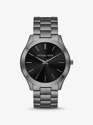 A timeless gift set for the one who has it all, this duo includes a Saffiano leather wallet and a refined timepiece for a sophisticated pairing. A perennial favorite, our iconic Slim Runway watch is designed in gunmetal stainless steel and features a sleek, understated dial for a modern finish. Wear it with casual-cool separates and tailoring alike.• Oversized watch