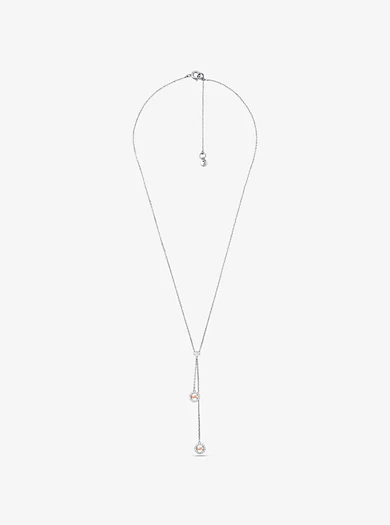 Nothing conveys glamour like a high-shine necklace with modern movement. Crafted from sterling silver with a precious metal plating, this two-tone style boasts a lariat silhouette that features two iconic logo charms outlined in sparkling pavé. We think it looks best styled with plunging necklines.• Lariat necklace