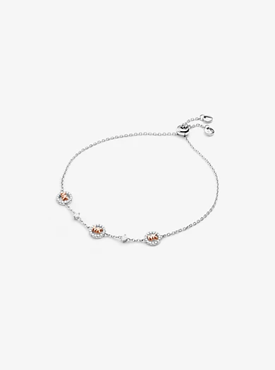 This high-shine slider bracelet will keep you looking polished day or night. With a dainty and easily adjustable chain, this luxe two-tone style features cubic zirconia stones and our iconic initials encircled with sparkling pavé accents. The mixed metals ensure it’ll match effortlessly with other accessories.• Slider bracelet
