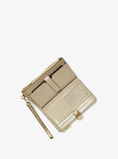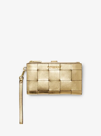 Crafted from woven strips of eye-catching metallic leather, this wallet has two zip sides that unfold to reveal a center with pockets for all the essentials—from credit cards to your smartphone. A detachable wristlet strap makes it versatile enough to carry alone or in a tote.• Smartphone wallet