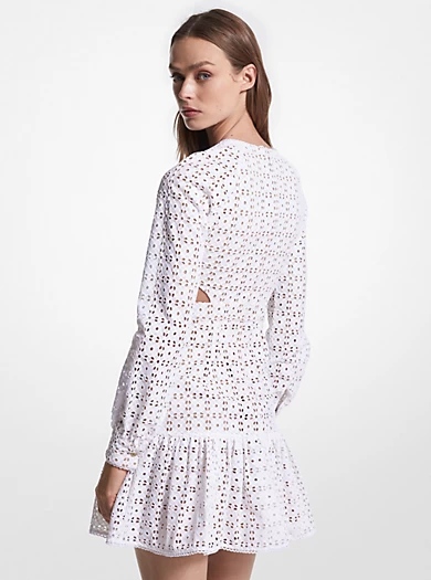 Just in time for vacation season, this mini dress is cut from breathable and lightweight cotton eyelet—perfect for enjoying a sunny, breezy day. Featuring a playful peplum hem and cut-outs at the waist, its flirty appeal is balanced by long sleeves and a round collar.• Dress