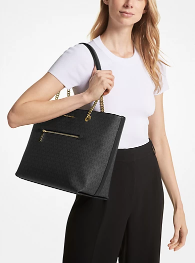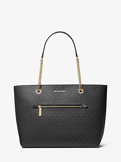 We updated our sought-after Jet Set tote bag with chain-trimmed handles for a hint of everyday glam. Made from Signature-print canvas, this sleek carryall opens to a pocketed interior that will comfortably hold a tablet, spare flats and wallet. Slip your phone into the convenient front zip compartment.• Tote bag