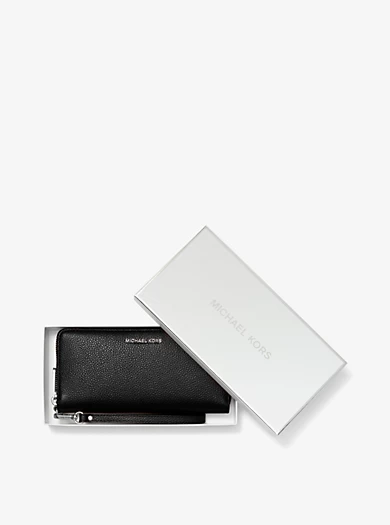 Keeping organized on the go is both effortless and stylish with our Jet Set wristlet. Crafted from pebbled leather, this classic accessory showcases an elongated shape with polished accents and a continental zip closure.• Continental wristlet