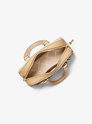 The Williamsburg satchel doesn’t just boast high-fashion credentials, it’s also decidedly practical. Designed in our Signature print with center stripes, this carryall is detailed with gold-tone hardware and has a structured, bowling bag-inspired shape. Carry it by the leather top handles or the crossbody strap depending on your plans.• Satchel
